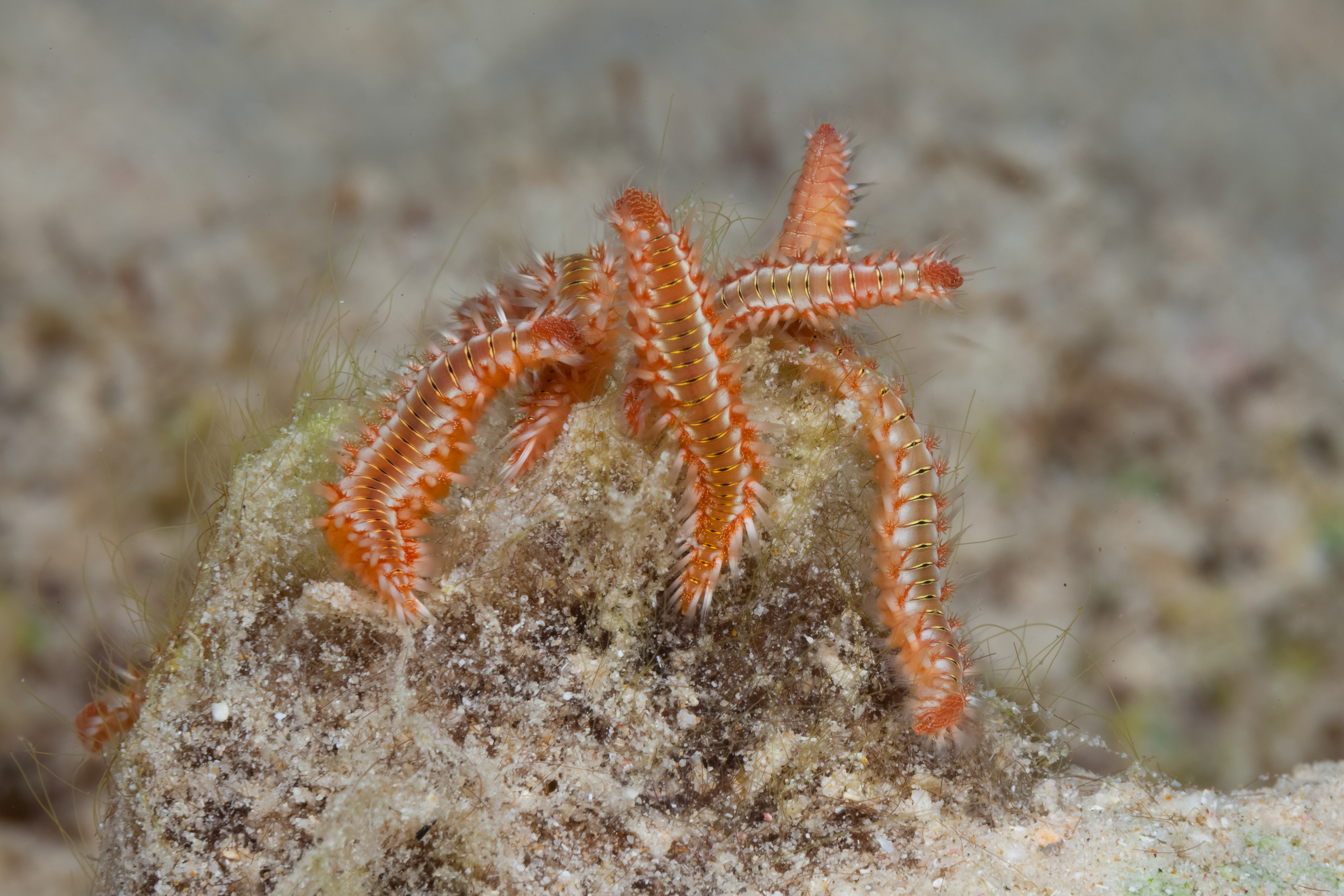 The bristles of the Bearded Fireworm can cause painful stings, so Divers should be careful to avoid touching them.