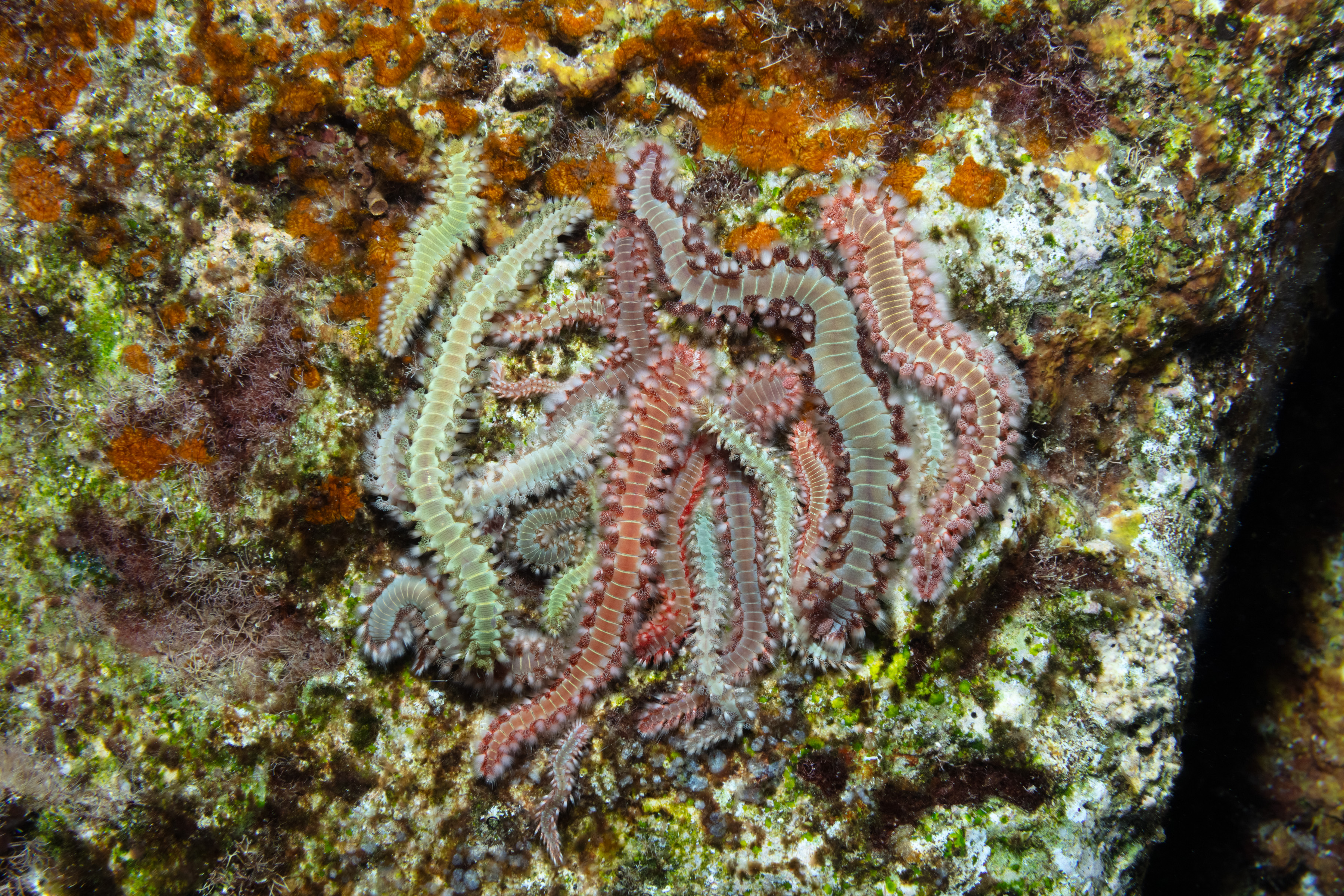 Groups of Bearded Fireworms like this can sometimes be seen, and the reason is not fully known. It may be related to hidden food, pre-spawning behavior, or simply sharing shelter.