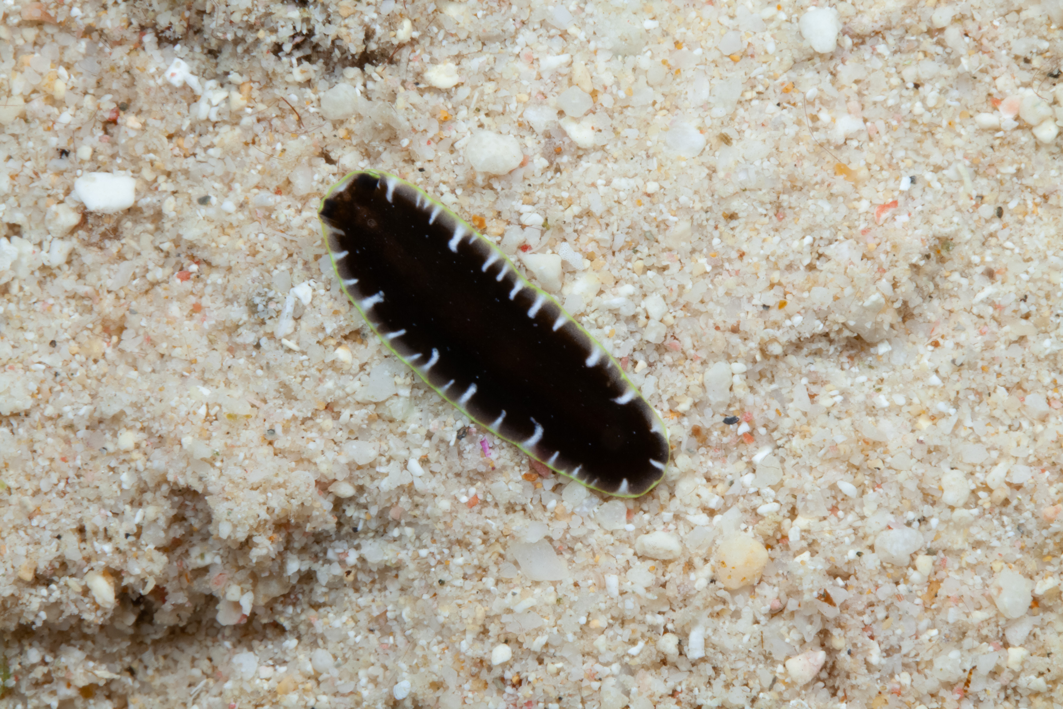 This Flatworm has a body that is dark brown or black. It displays white blotches or lines that extend inward from the edge, which may have a pale greenish-yellow border.