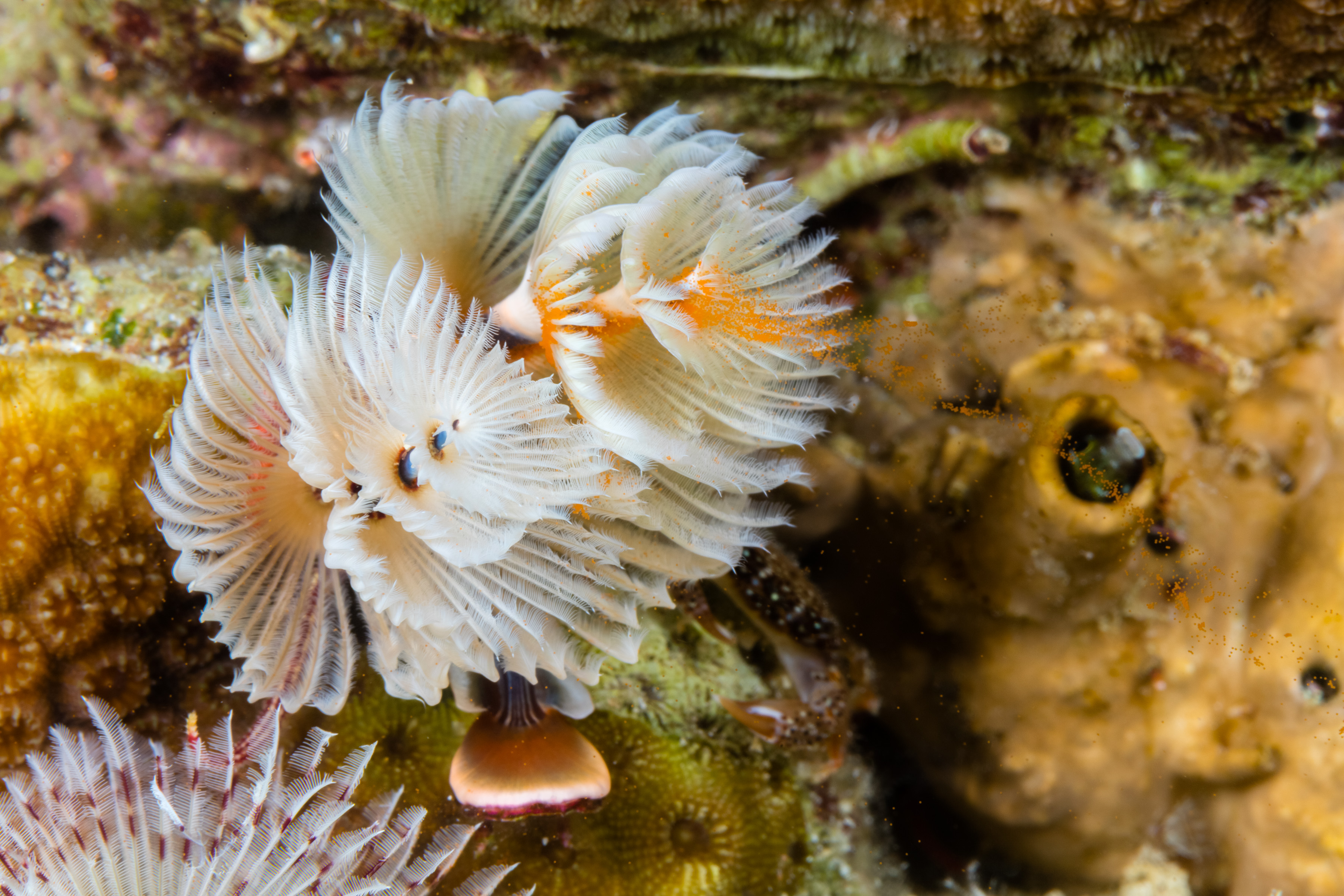 This Worm has two spiral crowns made of feather-like bristles that can be white or bright shades of purple, yellow, or orange. A double-horned lid sits between these crowns, and a hard, chalky tube fastens it to coral.