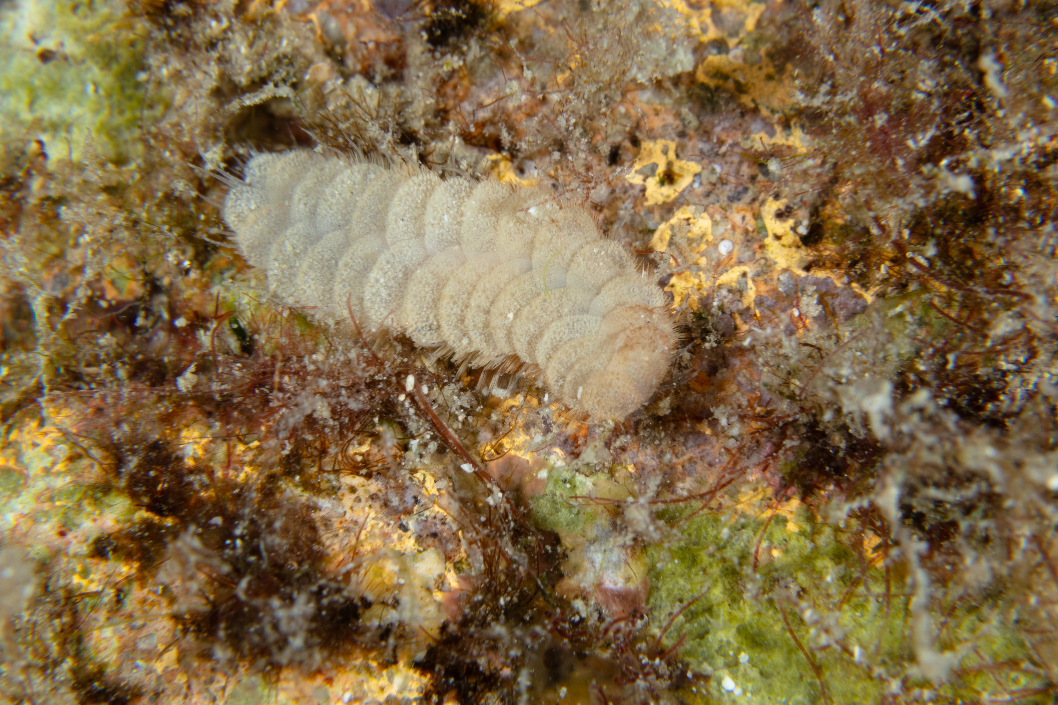 This Worm has oval scales that are light brown and appear rough due to small bumps. Pale cirri and dark feeding tentacles extend from its body.
