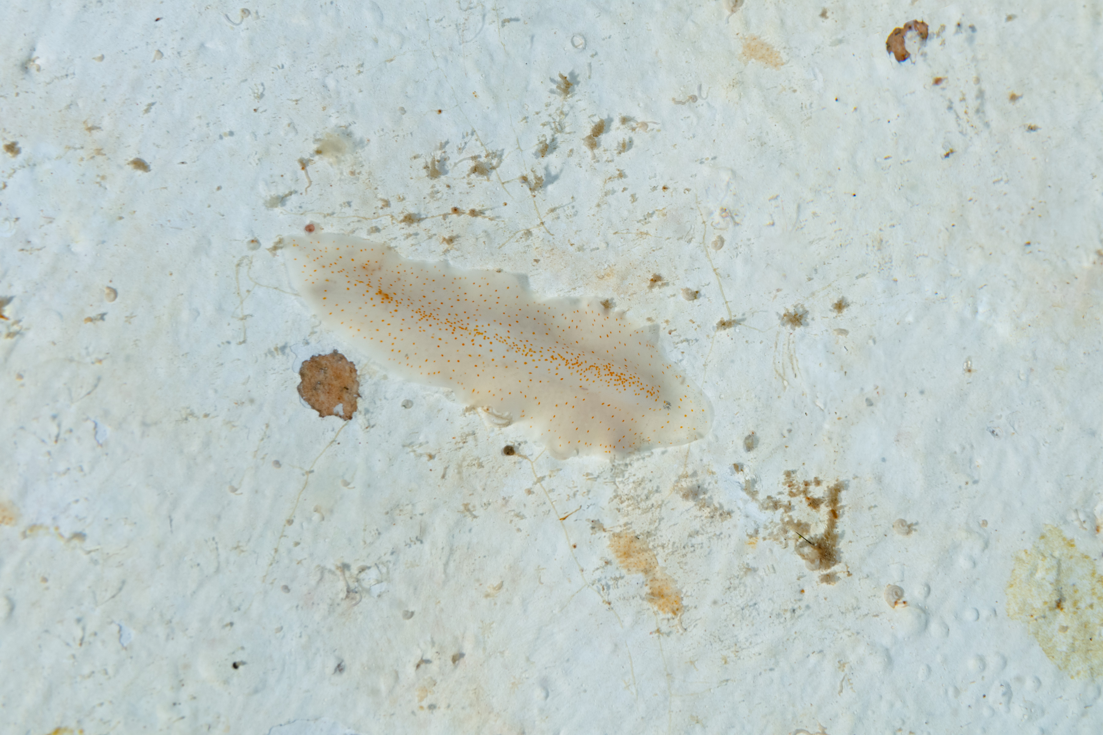 This Flatworm has an elongated, translucent white body with dense brown or orange speckling along the center, fading toward the edges.
