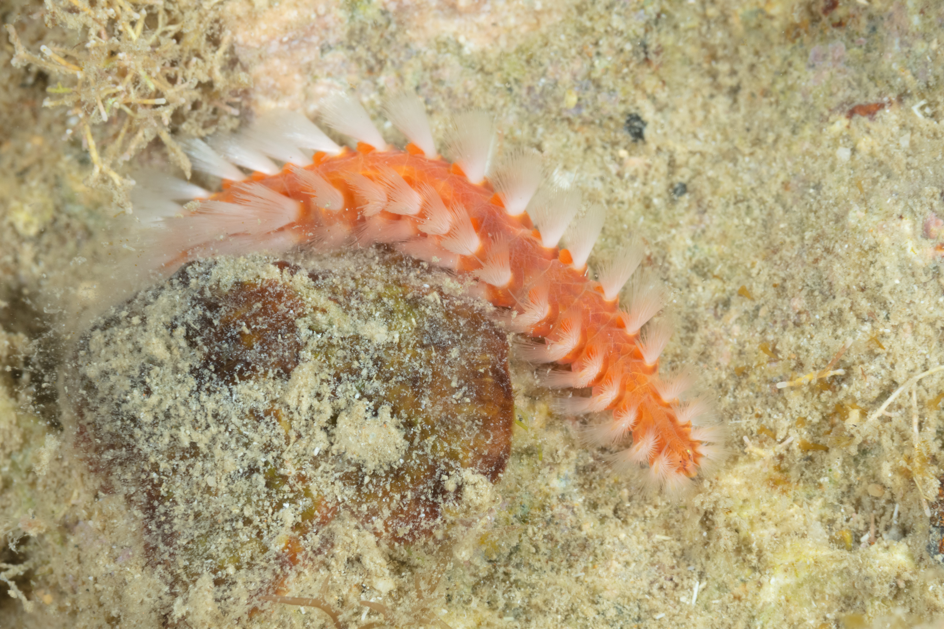 This Fireworm has a narrow, flattened body with clusters of white bristle. It is orange to red, often dark blue along the midbody.