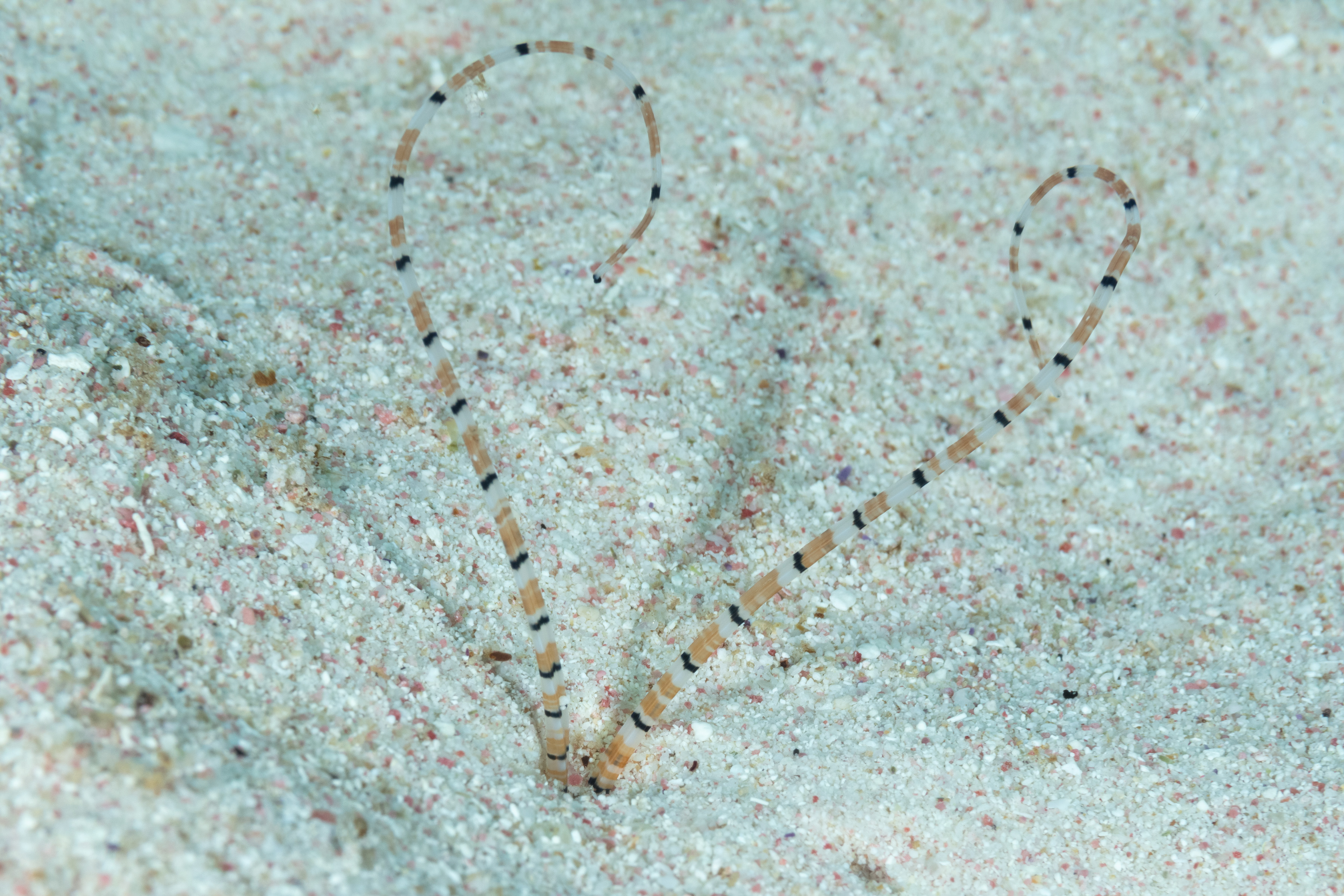This Worm remains hidden in the sand, extending two long feeding tentacles that have colored bands.