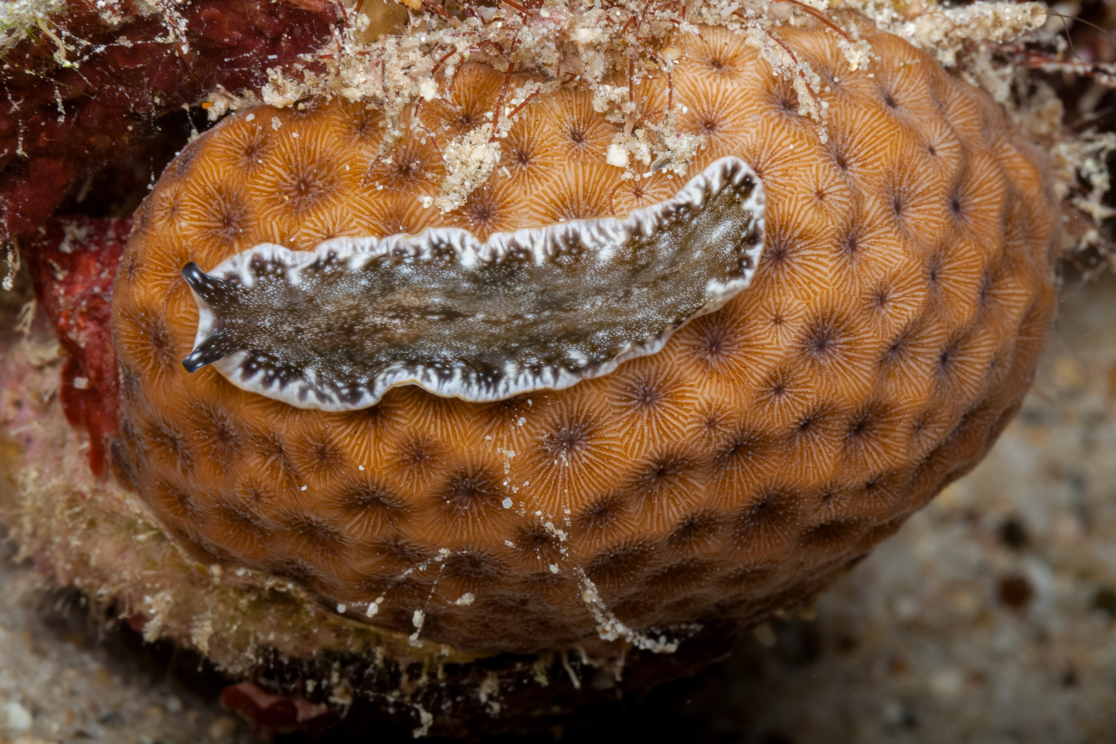This Flatworm has a black to reddish-brown body with white spots and a white border edged in orange. Broad white lines extend inward from the edges.