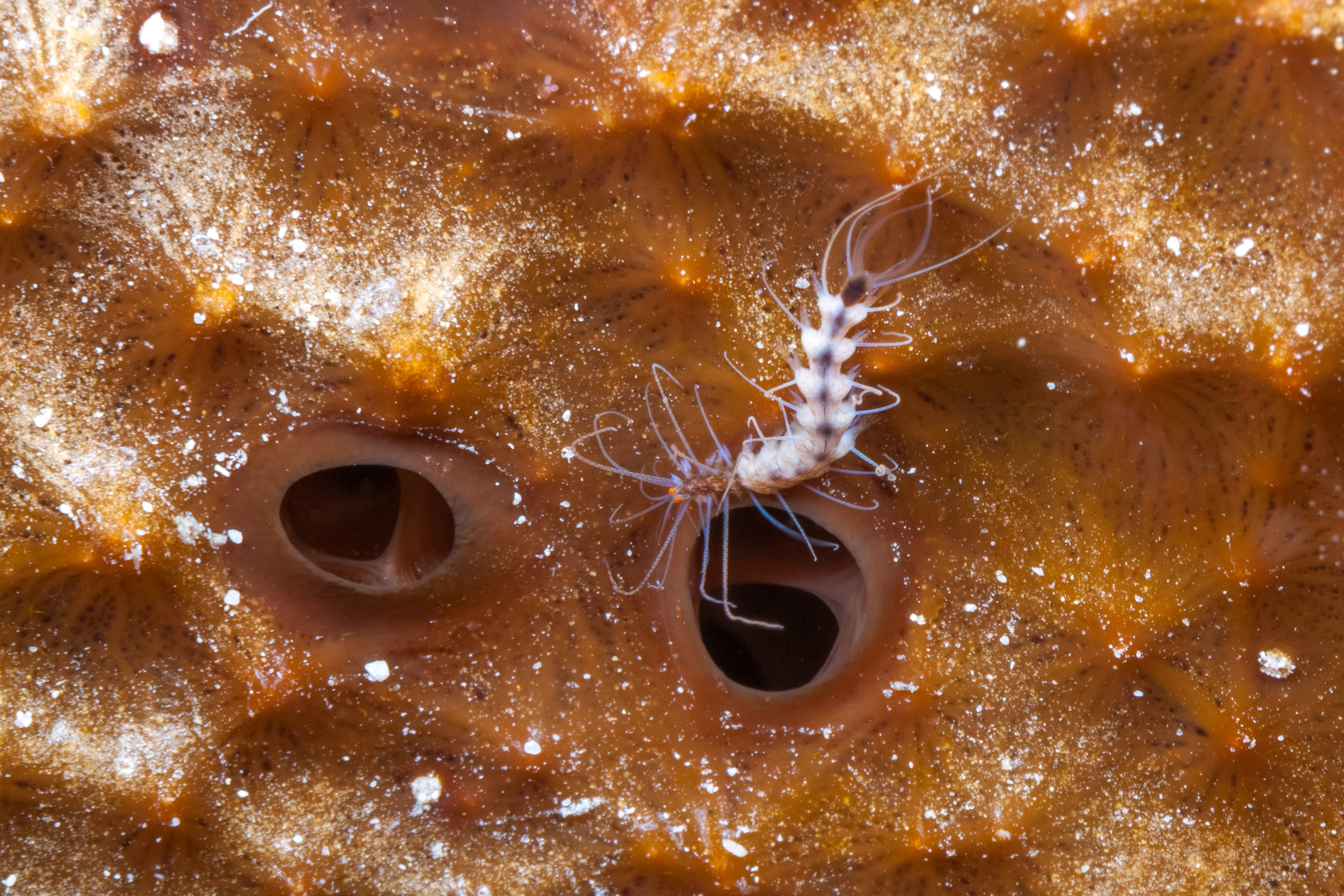 This Worm has a rounded, segmented body with thin, long white cirri. Its head displays bold dark patterns and two small orange eyes.