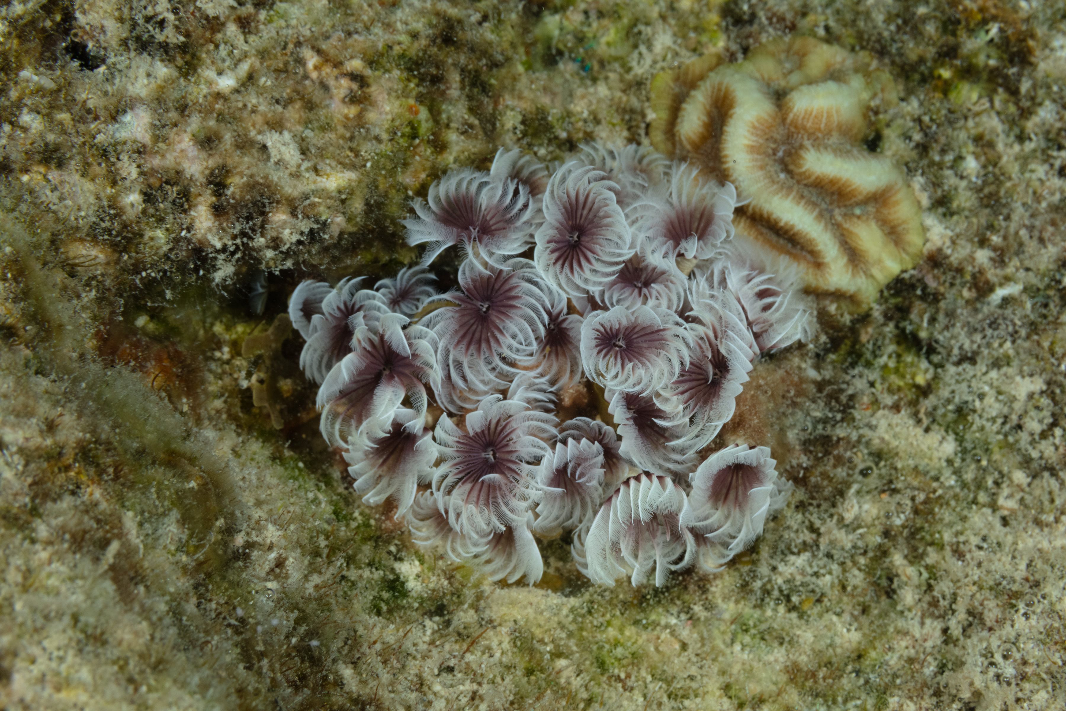 Social Feather Dusters form clusters in areas with good water movement. Their crowns extend for feeding but retract when disturbed.